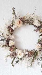 Gemeinsam binden wir Kränze aus Trockenmaterial auf Metallreifen (ca. 20 cm Durchmesser).